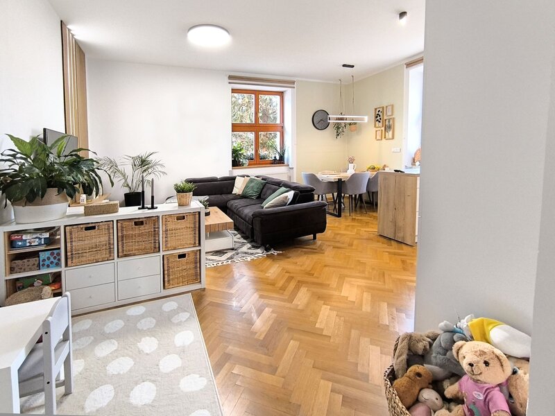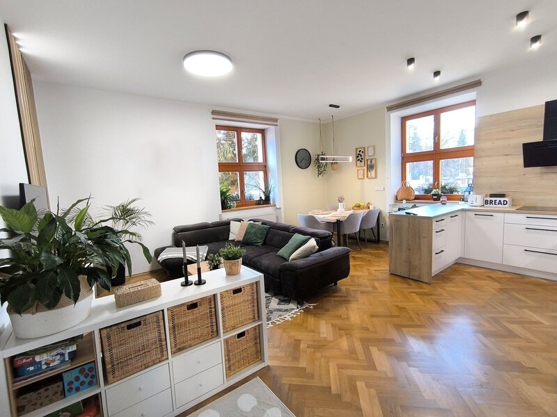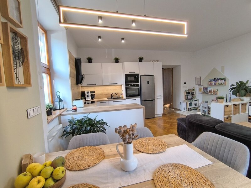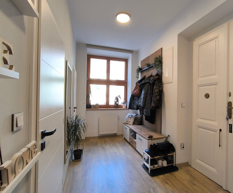Nabízíme kompletně zrekonstruovaný zděný byt 2+kk (rekonstrukce r. 2023/24), umístěný v 1.NP bytového domu v širším centru města, v atraktivní lokalitě Pražské předměstí. Byt je v osobním vlastnictví a nedávno prošel nákladnou rekonstrukcí, která mu vdechla novou, příjemnou tvář i atmosféru. Rekonstrukce zahrnovala: kompletní rozvody elektřiny, vody i odpadu, renovace parket, omítky, štuky, nová koupelna se sprchovým koutem, kuchyně, nový plynový kotel, radiátory, podlahové topení.. atd.). V ceně je též zahrnuta nová kuchyňská linka s vestavěnými spotřebiči (varná deska, trouba, digestoř, myčka). Vytápění je řešeno plynovým kotlem + radiátory, WC a koupelna disponuje podlahovým topením. Byt nabízí velmi praktické uspořádání, hlavní dominantou je prostorný obývací pokoj s kuchyňským koutem a jídelnou, dále ložnice, která má samostatný vstup z velké předsíně. Celková užitná plocha bytu (bez sklepa) je 60 m² . Velmi prostorný zděný sklep (11,2 m²) je umístěn v suterénu domu. Lokalita Pražské předměstí je přesně ta, kde nechybí nic, co ke spokojenému bydlení potřebujete, jde o kombinaci klidného bydlení se všemi výhodami centra města. Veškerá občanská vybavenost se nachází v docházkové vzdálenosti (obchody Družba a IGY – do 200m, restaurace, MŠ, ZŠ i lékař – vše doslova za rohem). Parkování – přímo u domu nebo na nedalekém parkovišti. Měsíční náklady jsou velmi příznivé – cca 2 500 Kč fond oprav a služby + zálohy plynu. Energetická náročnost (PENB): G (=bude aktualizováno). Tento byt je ideální volbou pro ty, kteří ocení precizní provedení rekonstrukce, bez nutnosti dalších investic a chtějí bydlet v širším centru města s veškerým komfortem, přitom v klidné lokalitě plné zeleně.